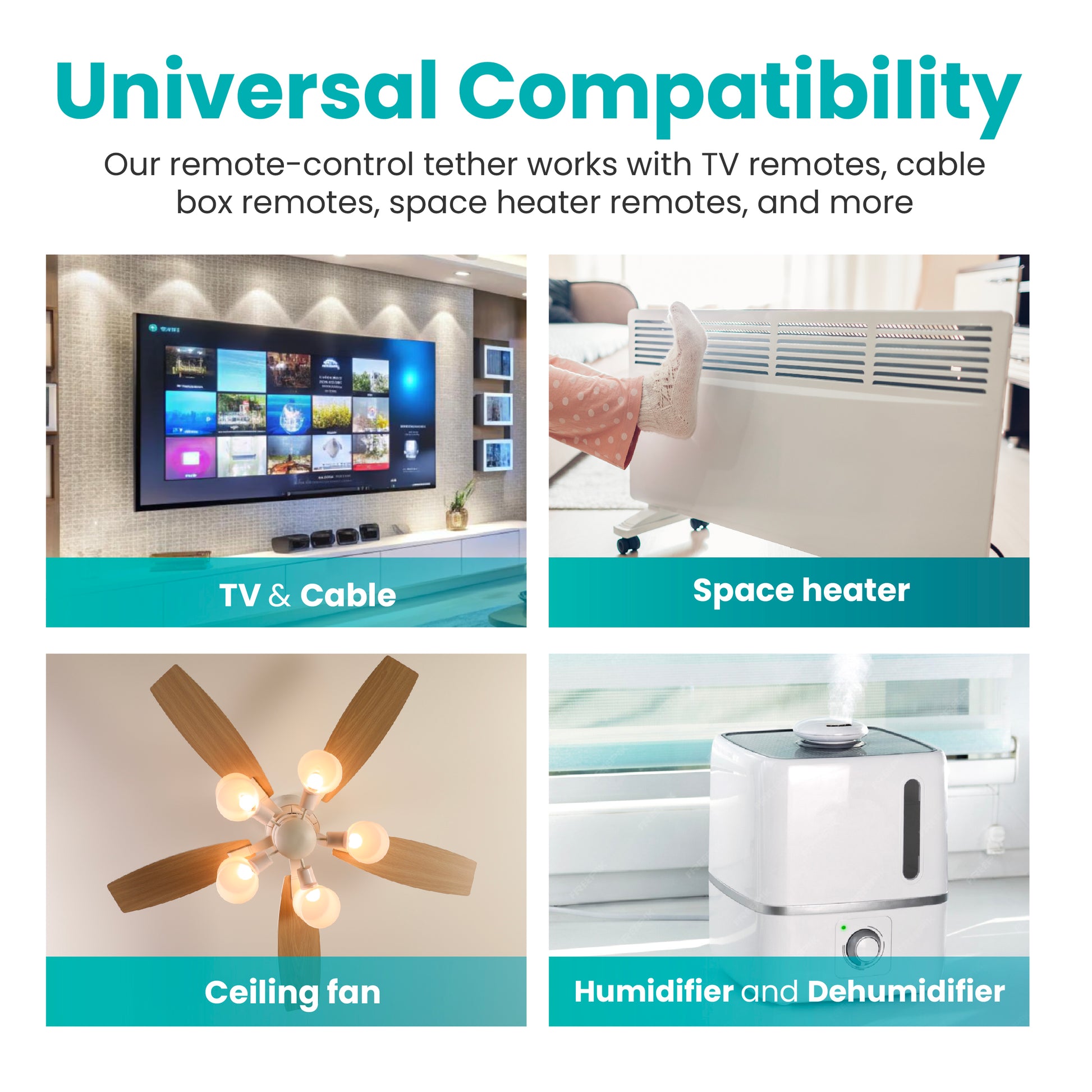 - UNIVERSAL COMPATIBILITY: Our remote-control tether works with TV remotes, cable box remotes, space heater remotes, and more. Never lose your remote again with this versatile solution for any setting.